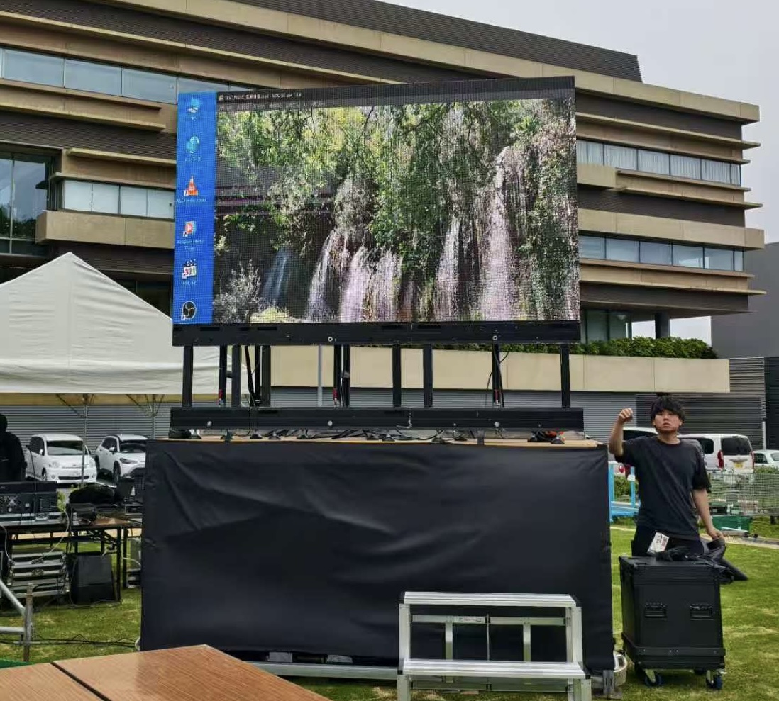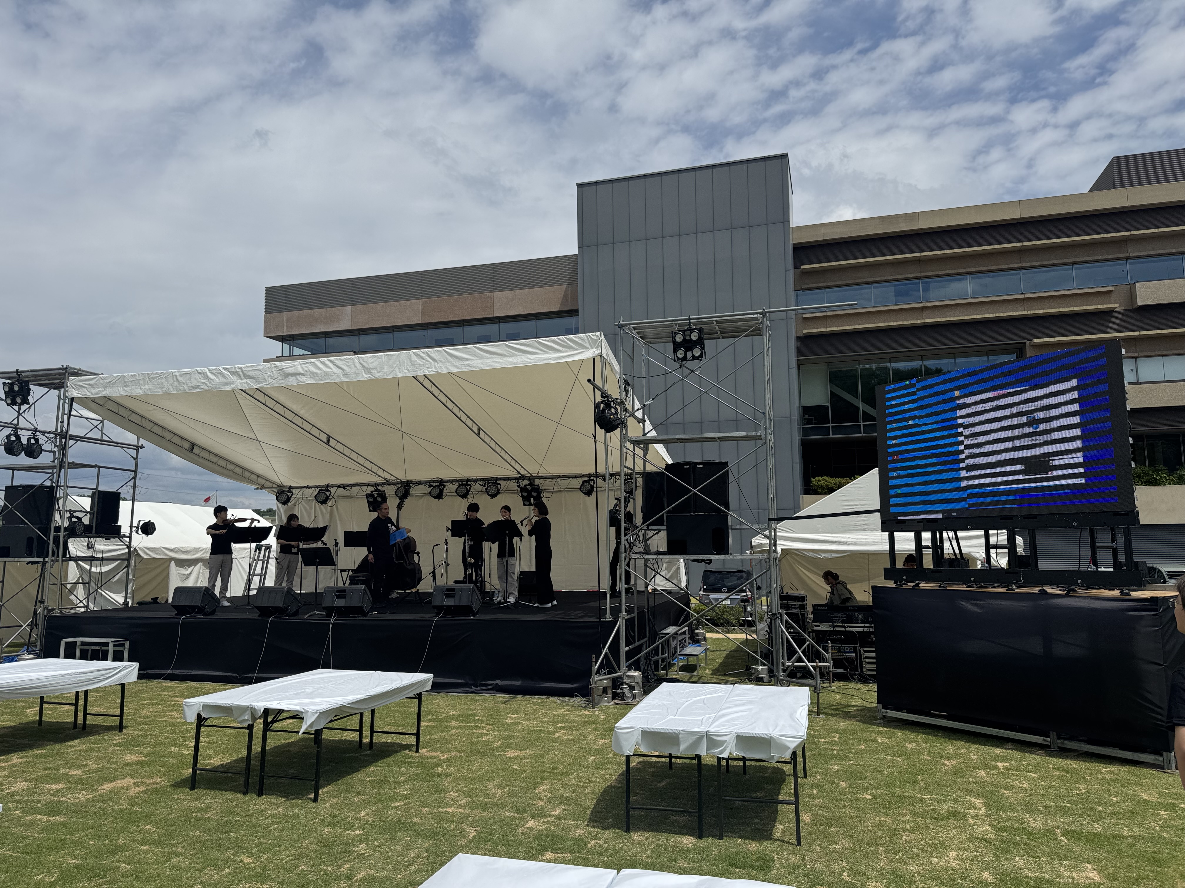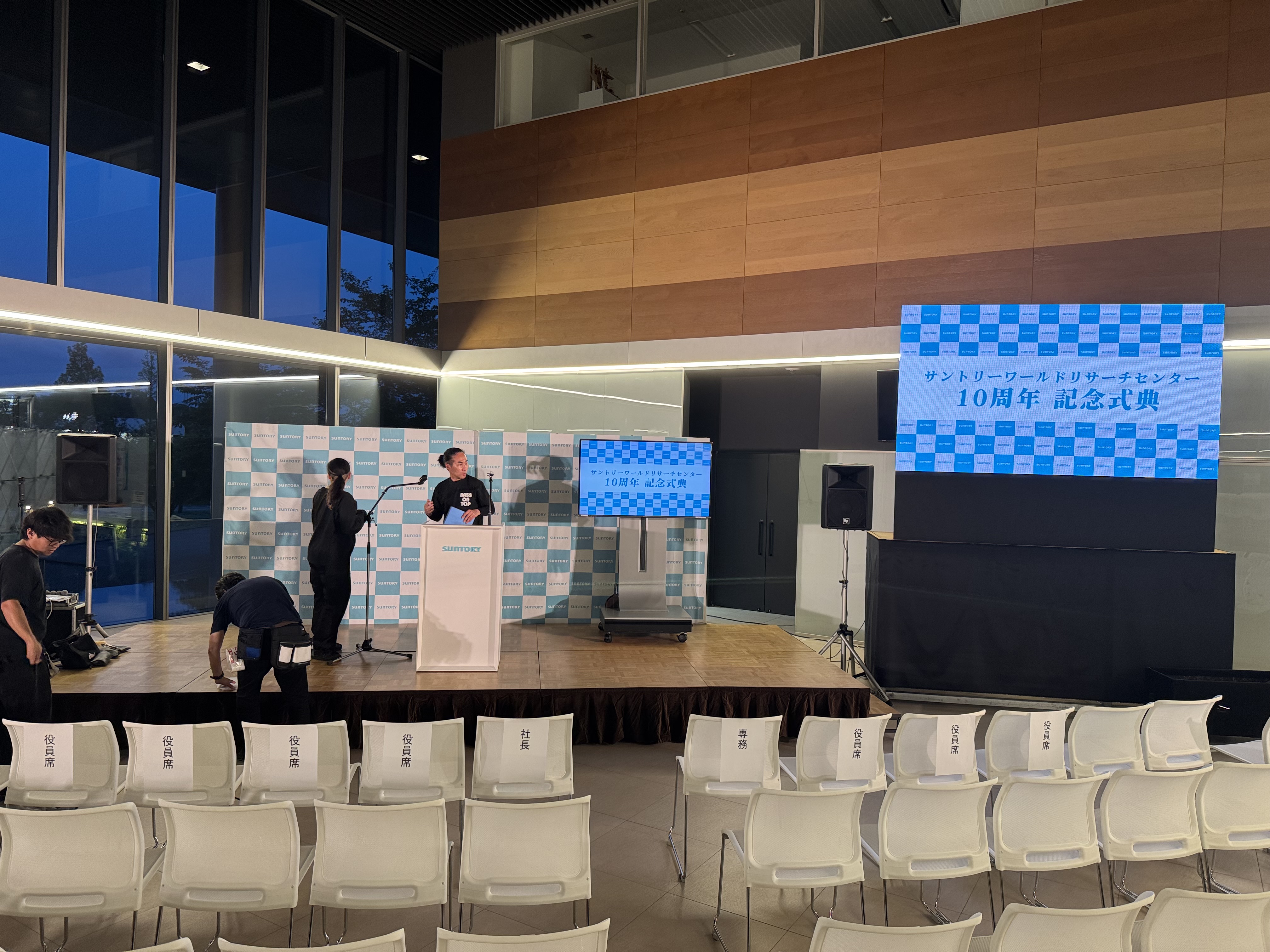 LED現場 2025.05.31 京都の某所10周年記念で屋内式典用LEDと屋外パーティー用LEDを同時レンタルしました S社の京都ワールドリサーチセンター開所10周年記念式典で、屋内用LED&映像オペレーションと屋外用LEDの現場。 サイズがそれほど大きくないので、後ろのお客さんにも見えるように屋内屋外とも嵩上げしています。 各会場、環境に合わせたご提案を打ち合わせ段階からさせて頂きます。
