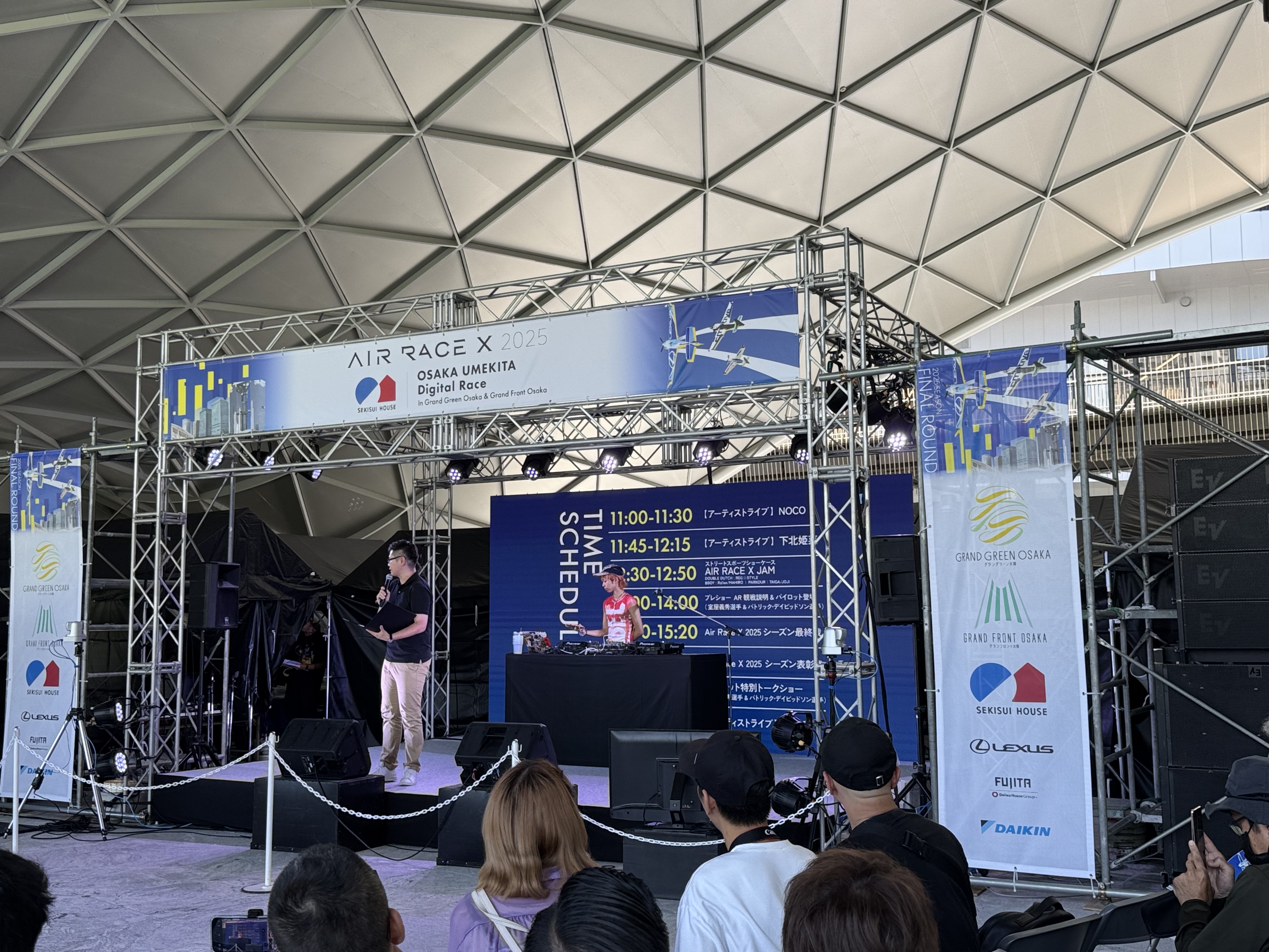 LED現場 2025.09.05 大阪駅すぐそば、うめきた公園で「AIR RACE X」のメインステージと駅前広場の屋外ステージLEDレンタルしました。 2会場同時進行でAR技術を利用した飛行機レース。 スマホを使って空中レースを楽しむ方法とステージ上のLEDで楽しむ方法です。 レース以外ではミニライブがあったり、トークショーで盛り上がりました!